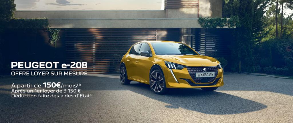 En location longue durée sur 36 mois et pour 500 km par mois Exemple pour la location longue durée (LLD) d’une Peugeot e-208 Like neuve, hors options. Montants exprimés TTC et hors autres prestations facultatives. (1) Après déduction du bonus écologique d’un montant de 5 000€ et 2000 € supplémentaires selon les conditions du décret du 30 décembre 2022. Voir conditions d’éligibilité sur https://www.economie.gouv.fr/particuliers/bonus-ecologique et de la prime à la conversion gouvernementale de 2 500€ (voir conditions d’éligibilité sur www.primealaconversion.gouv.fr) sous condition de reprise d’un véhicule diesel immatriculé avant le 01/01/2011 ou d’un véhicule essence immatriculé avant le 01/01/2006, selon décret en vigueur. Offre valable du 01/05/2023 au 31/05/2023, réservée aux particuliers pour toute LLD d’une Peugeot e-208 neuve dans le réseau Peugeot participant, sous réserve d’acceptation du dossier par CREDIPAR, SA au capital de 138.517.008 €, RCS Versailles n° 317 425 981, ORIAS 07004921 (www.orias.fr), 2-10 boulevard de l’Europe 78300 Poissy. Offre non valable sur le site store.peugeot.fr.