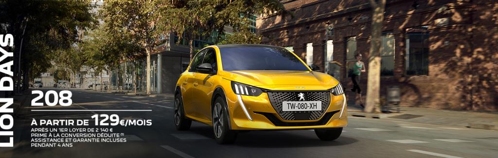 (1) Nouvelle Peugeot 208 à partir de 129 €/mois, après un premier loyer de 2 140 €. Prime à la conversion déduite (1). Assistance et garantie inclus pendant 4 ans. En location longue durée sur 49 mois et pour 40 000 km. Exemple pour la location longue durée (LLD) d’une nouvelle Peugeot 208 Like PureTech 75 S&S BVM5 neuve, hors options, incluant l’assistance et l’extension de garantie pendant 49 mois. Montants exprimés TTC et hors prestations facultatives. (1) Sous réserve d’éligibilité à la prime à la conversion gouvernementale de 1 500 € sous condition de reprise d’un véhicule diesel immatriculé avant le 01/01/2011 ou d’un véhicule essence immatriculé avant le 01/01/2006. Offre valable du 01/10/2021 au 31/10/2021, sous condition de reprise, réservée aux personnes physiques pour un usage privé pour toute LLD d’une nouvelle Peugeot 208 neuve dans le réseau Peugeot participant, sous réserve d’acceptation du dossier par CREDIPAR, loueur et SA au capital de 138.517.008 €, RCS Versailles n° 317 425 981, ORIAS 07004921 (www.orias.fr), 2-10 boulevard de l’Europe 78300 Poissy. Offre non valable pour les véhicules au prix Peugeot Webstore et les véhicules sur le site store.peugeot.fr. Le Contrat de Service Pack Extension peut être souscrit indépendamment de toute LLD aux conditions disponibles dans le réseau Peugeot participant.